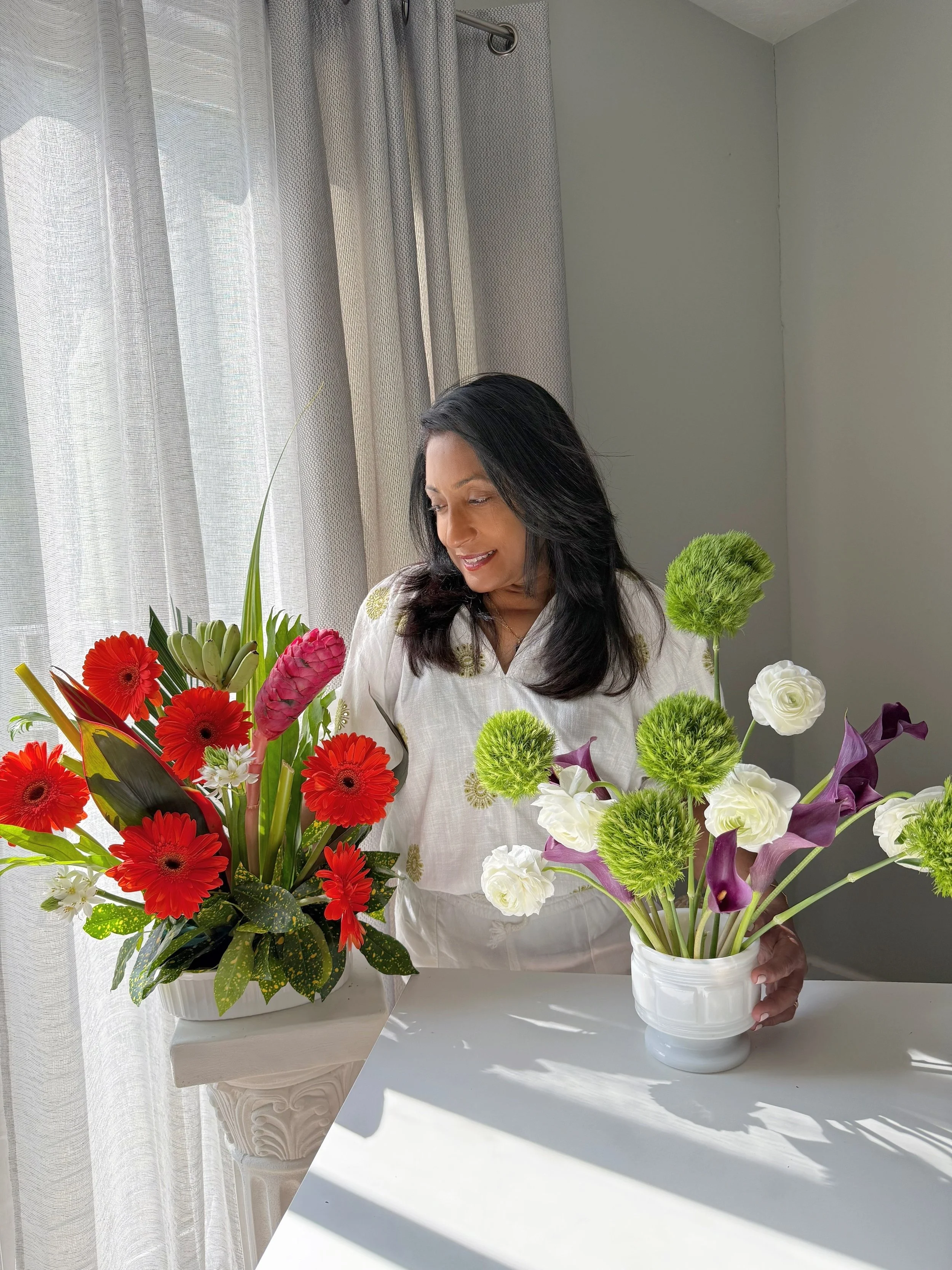 Marina began her journey as a wedding florist in Sri Lanka over 30 years ago, designing bespoke floral arrangements for weddings, churches, and milestone celebrations. Known for her eye for detail and graceful style, she built a reputation for creating elegant wedding flowers that felt both timeless and deeply personal.